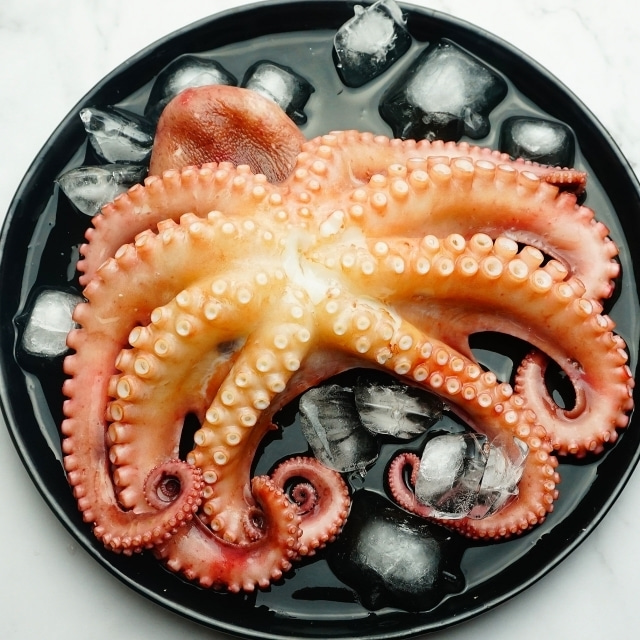 9. 다 익은 문어는 미리 준비한 얼음물에 담갔다가 건져내면 쫀득한 식감을 가지게 돼요.