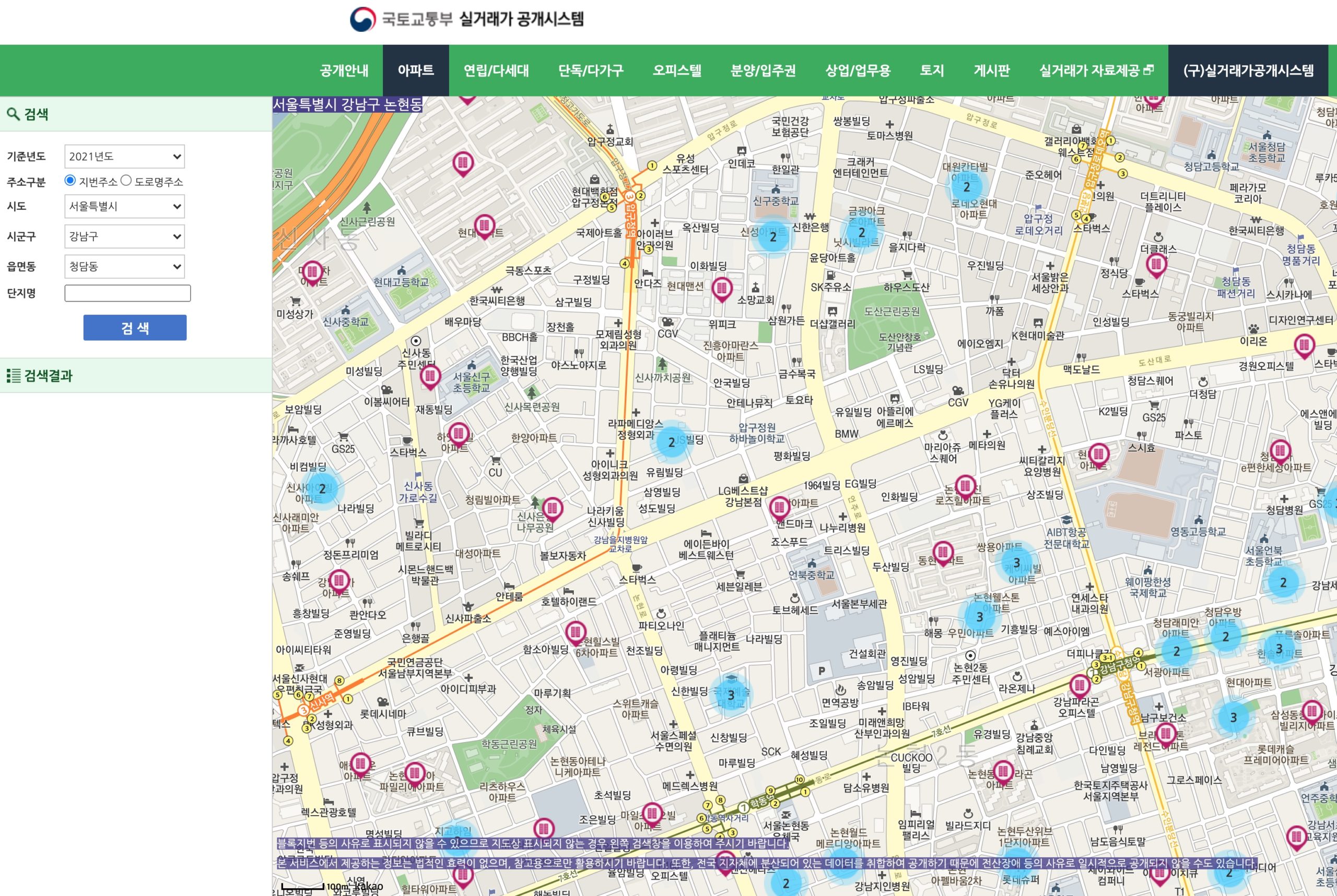 공식적인 자료를 기반으로 하므로 국토교통부와 같은 자료를 체크가 가능해요. 상기 사이트로 이동하게되면 구글 조회와 같이 바로 첫 화면에 원하는 조회를 하도록 간편하게 운영되고 있어요.
