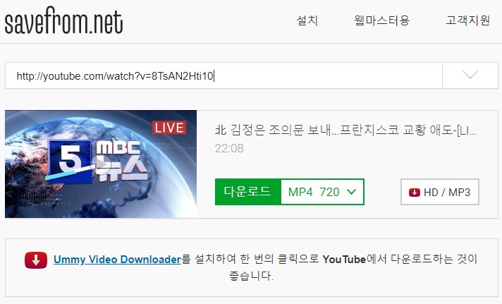 또는 유튜브 동영상 주소에 ss를 붙이니 바로 밑에 savefrom video downloader라고 나오는게 보이라고 합니다. 이런식으로 ss를 추가한 후 엔터를 치면 savefrom.net 사이트로 이동하여 다운로드가 가능해요.