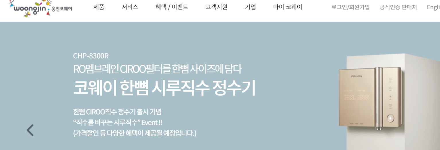 정수기 뿐만 아니라 비데, 청정기 등 웅진코웨이 제품을 이용하시는 분들이 많으실텐데요. 정수기 브랜드중 잘나가는 3대장중 하나라고 생각합니다. 정수기 뿐만아니라 공기청정기나 비데 등등 여기저기가지 제품이 넉넉하게 있습니다.